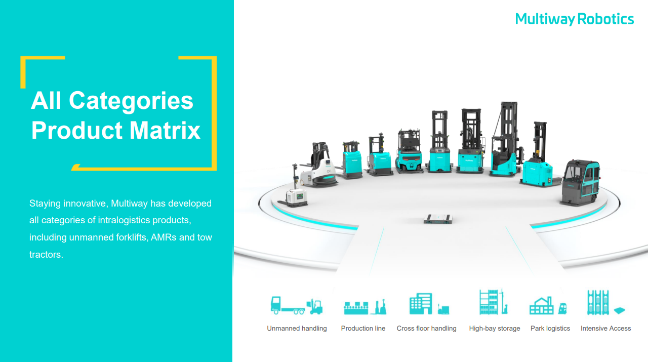 ハードウェア面では、自律型フォークリフト、AMR、無人牽引車、および4方向シャトルシステム含む幅広い製品ポートフォリオを確立しています。ソフトウェア面では、WMS、RCS、WCS、現場管理システムおよび複数のビジョンベースのソリューションを独自開発しています。ハードウェアとソフトウェアの深い連携を通じて、Multiwayは製造、倉庫、物流の各シーンに安定的かつ効率的、持続可能なスマート物流機能を継続的に提供しています。